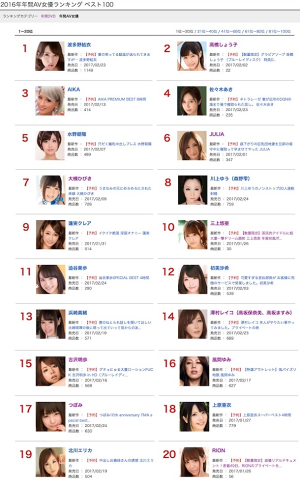 只能說大家真的都非常厲害呀,去年一堆AV女優引退惹的粉絲傷心難過,在競爭激烈的AV界中有妳們的貢獻HiLive真的很感謝呀,波多野結衣拿下銷售冠軍真的太讓人開心,請妳一定要一直努力拍片下去,因為妳的好友上原亞衣已經引退,AV界真的靠妳這位前輩了(泣)HiLive恭喜波多野結衣報導。
