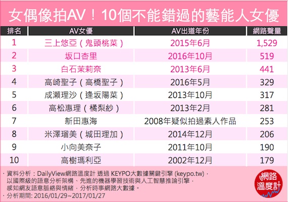雖然2016下半年大家看到許多AV界的黑暗面,但AV界還是有許多正面及勵志AV女優故事,不久前DailyView網路溫度計運用《KEYPO大數據關鍵引擎》,整理出十個曾是藝人卻因不同理由下海拍AV的名單,每位都是超人氣的AV女優,有的甚至出現在情報中許多次了,看看大家是否有漏掉哪位精彩的作品。