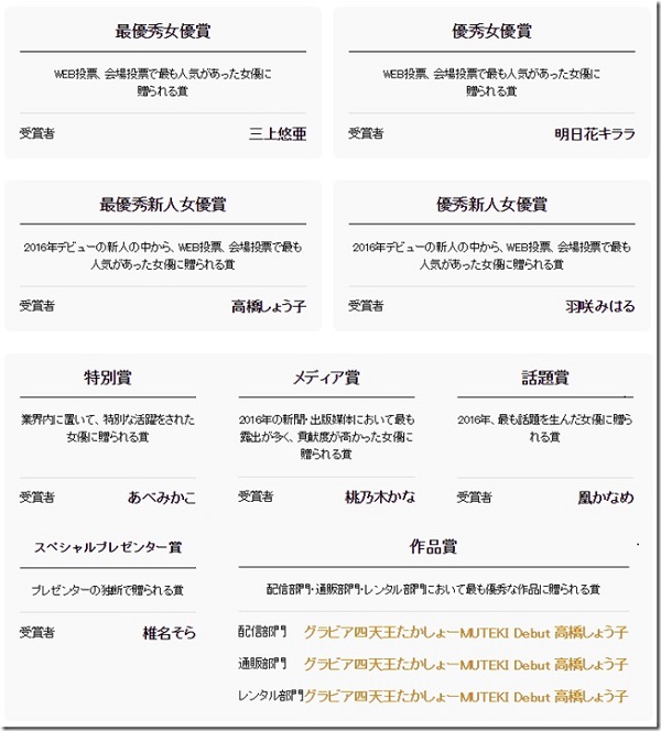 上次看到AV界盛事『DMM最優秀女優票選DMMアダルトアワード』(DMM Adult Award 2017 )得獎女優出爐了!今年激烈的對決真的好精彩也好感動,而且2017年的賽事又被稱為最盛大的一年,讓我們繼續看下去精彩的得獎女優。