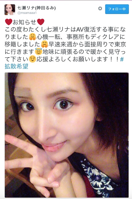 因為『神田留美』改名為『七瀨里菜』的作品銷售並不理想,之後就在AV界銷聲匿跡進行神隱模式了,一直到2017年,她突然在推特上宣布: