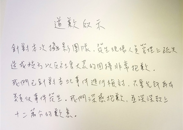 『針對TAE拍攝宣傳影片的校服事件,外發攝影團隊發生現場人員管理上疏失,是主辦單位責任與日本吉川愛美本人及其經紀公司無關。造成校方及社會大眾困擾非常抱歉。我們已針對本次事件進行檢討,不會允許再有類似事件發生。我們深感抱歉,並致上十二萬分歉意,特此登報聲明。』