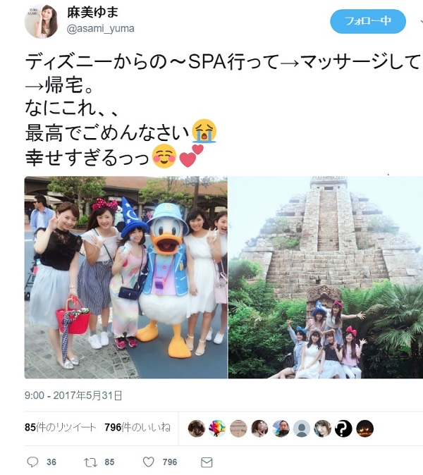 AV女優吉澤明步(吉沢明歩)在twitter,分享與麻美由真(麻美ゆま)、西野翔、葵司(葵つかさ)等人一起開心到迪士尼樂園玩留下美好回憶。網友紛紛twitter留言驚嘆「好強大的AV女優陣容呀」,並大讚她們可愛。