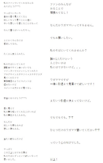 沒想到一年很快就到了,眼看著和父母約定好的時間已經到,江上志保決定要兌現諾言離開引退,並在自己的BLOG上寫下這則消息: