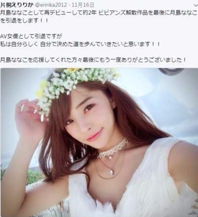 不久前11/16日,月島菜菜子終於在twitter上正式像粉絲宣布自己從AV界引退!!!