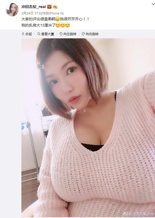 目前沖田杏梨重心都在大陸所以很用心微博發文,前幾天她更透露自己因為懷孕的關係,胸部又大了15厘米呀!這麼大的巨乳,導致根本看不出來懷孕三個月的孕肚。