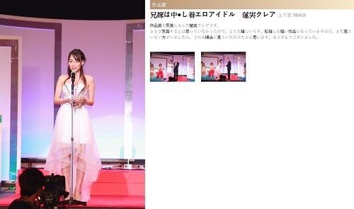 得獎的是以中出亂倫題材作品奪下獎項的『蓮實克蕾雅(蓮実クレア)』,大家很常誤會她是混血兒,雖然名字聽起來很像外國人,但是她可是一點外國血統都沒有,是個純正的櫻花妹呢,有名的就是只要被男優輕碰乳頭下面就會溼透,又被稱為最有爆發力的癡女。