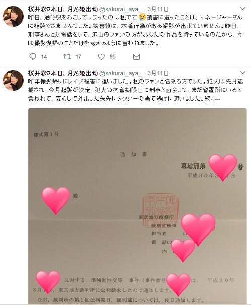 2017年某日晚上AV拍攝回家途中時,遇到了一名自稱是粉絲的男子突襲她,然後被對方性侵得逞,讓她身體跟心靈受到很大驚嚇,至今心情仍未平復,導致沒有辦法接著拍攝新作品、粉絲見面會等出現在鏡頭前的機會也減少許多。