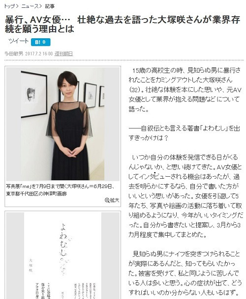 《週刊朝日》曾經報導過另一位AV女優潮吹天后『大塚咲』的事,她15歲念高中時,曾被男子拿刀威脅後性侵,她說著:「我在那天猶如靈魂被謀殺一般,從那天起,我就感受不到自己的未來!」,被性侵後因為精神狀況不穩定,她只好輟學進入AV界下海當AV女優。