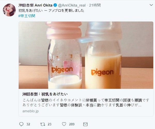 宣佈第二則喜訊,告訴大家她懷孕時!懷孕期間她持續PO出自己的日常照,當時就引起大家好奇,因為原本就擁有L奶傲人身材的她,懷孕後胸部又大了15公分!!甚至把胸部放在桌上的體積比頭還要大,令人驚嘆不已!(除了沖田杏梨還有誰辦的到)