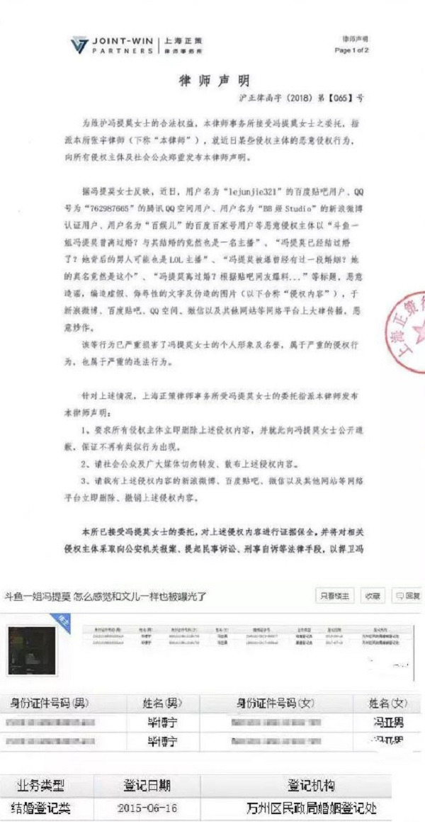 雖然「馮提莫工作室」第一時間委託律師出面否認並發表聲明,聲明中她否認已婚、陪睡,並說這些都是網路傳言,但相信的網友似乎越來越少,這個風波一波未平一波又起,最近網路上傳出多張露臉床照、激戰前的直播等,連她登記結婚的資料也一併曝光,讓不少粉絲好心碎,直呼:「太綠茶了!簡直不要臉太噁心!」