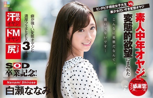 就是因為SOD你一直欺負人家,這次白瀨七海在作品中被一个變態男性玩完惡整後,決定徹底的消失並逃離SOD的魔掌!10月份推出的作品『ピッチピチ現役女子大生 vs 美少女だいすき変態オヤジ 素人中年オヤジたちの変態的欲望にまみれたマニアックファン感謝祭!』也是她在SOD集團專屬的最後一支作品!算算她真的很受重視,在SOD子品牌「君に惚れた!」也發行過9部作品了。(想必一定累積了不少怨恨呀XD)