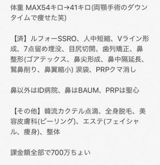 她列出整型項目在全身21個部位動刀,包含兩顎手術、縮人中、削骨、V臉塑形、開眼頭、矯正牙齒、鼻子整型、消除眼袋黑眼圈等。成功從54公斤瘦到了41公斤,身材更顯苗條,而她公布變身成果照,除眼袋黑眼圈等手術後居然神撞臉日本當紅女優明日花綺羅,被網友笑稱是按照明日花綺羅的樣子整容的吧。