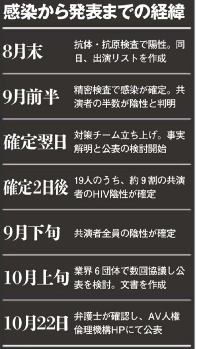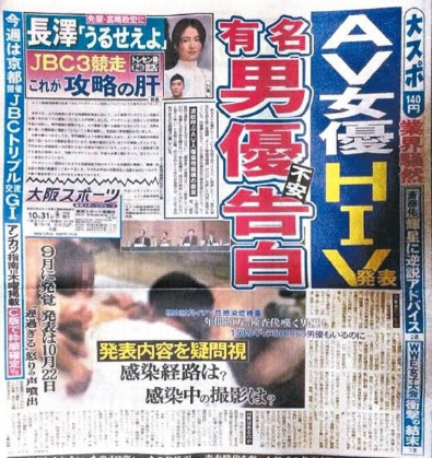 據《日刊SPA》進一步報導,10月22日,「AV人權倫理機構」透漏有AV女優感染愛滋病病毒,讓業界引起軒然大波。該女優於9月確診罹患愛滋病,中標後仍繼續工作拍片!