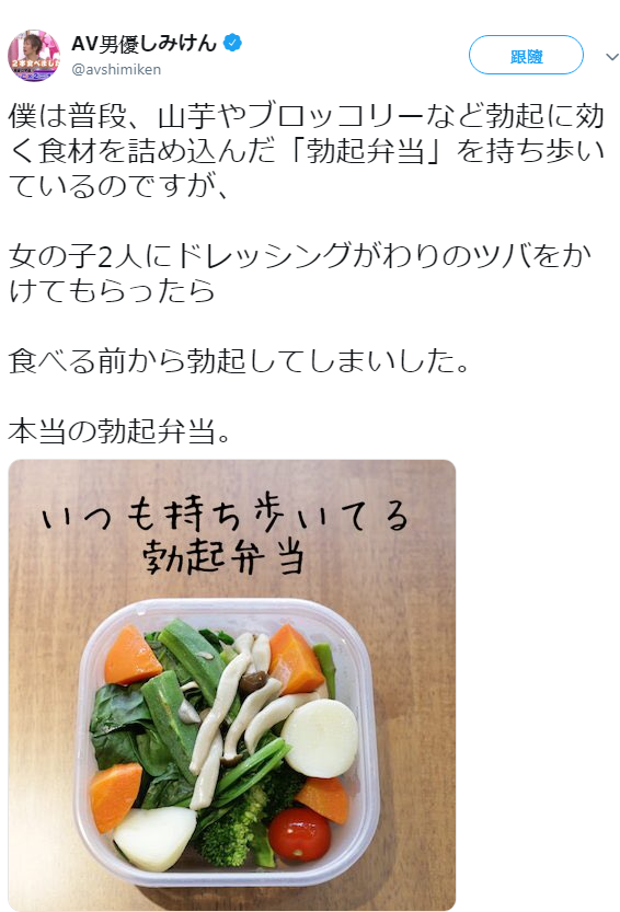 入行20年來除了要運動鍛鍊身體以外,飲食也是相當重要的,所以還有一個大絕招就是幫自己準備「勃起」便當,這可是我的精力跟性慾的泉源呀。