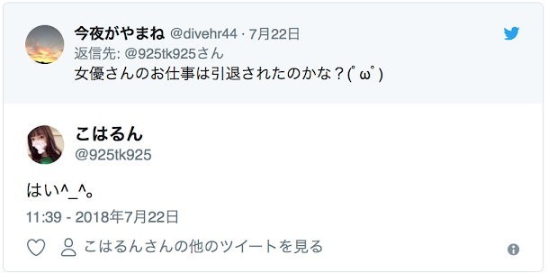 回顧一下當初她在自己twitter「こはるん(オタサーの姫)」上回覆粉絲,表示自己已經從AV的工作引退。