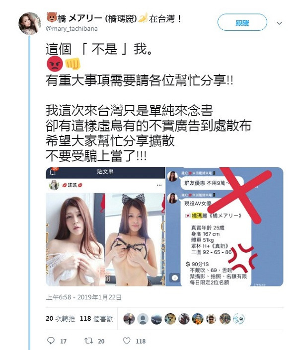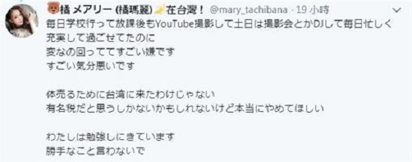 橘瑪莉說來台灣唸書的自己每天行程滿檔,上完中文課後後要拍YouTube影片、還有週末的攝影會以及DJ工作,根本沒有時間去外送茶賣春,所以希望大家幫忙分享,不要再受騙上當了!