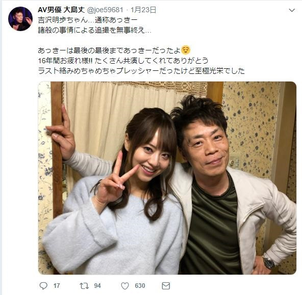 正當眾人開始好奇與她最後肉搏的對象時,資深AV男優大島丈就在推特公開與吉澤明步的片場合照!沒錯~這位做為天后引退作的幸運男優就是大家耳熟能詳的『大島丈』呀!兩人在作品中也合作過許多次了,所以這次的引退作是最後一部,演起來真的是百感交加呀。