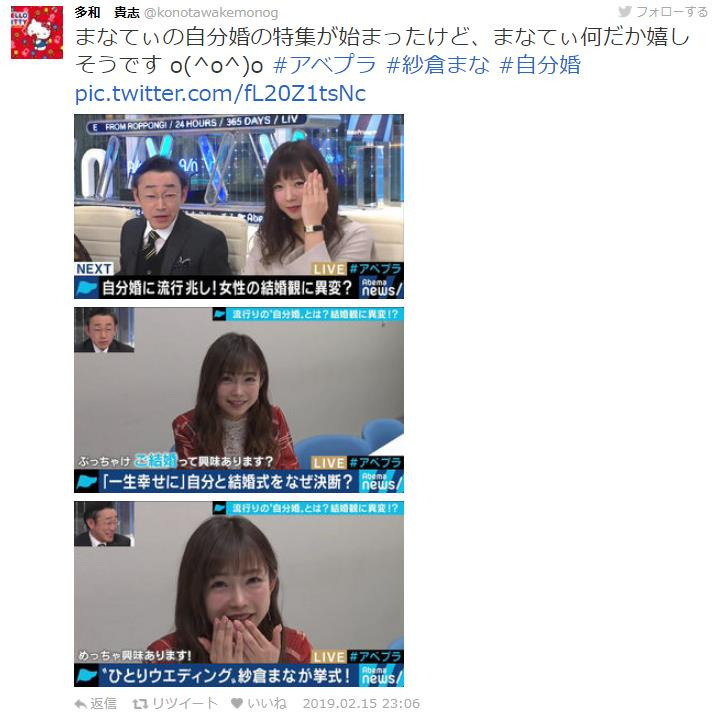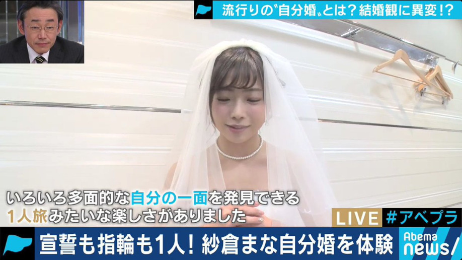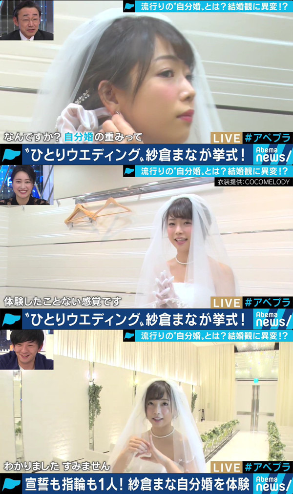 大家一定以為『啊~其實是AV劇情對不對』,大家可猜錯了呢,這可不是AV影片橋段,原來她真的嫁了,只是嫁給了自己!這次是紗倉真菜被網路節目「Abema_Prime」邀請,特地體驗了「自己嫁給自己」的婚禮過程,製作單位還煞有其事得找來神父為她證婚,她感概的說著: