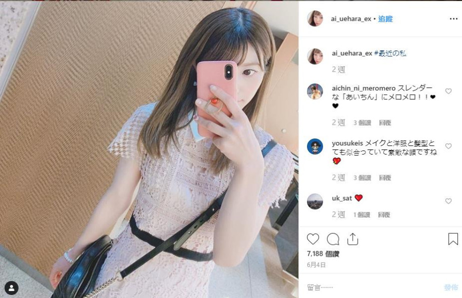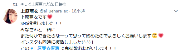 畢竟是天后等級,上原亞衣即使在引退後人氣還是仍相當高,這次復出於社群網站的消息一出,讓喜愛她的粉絲「超級興奮」,短短3週就吸引12萬人追蹤,甚至就連其他年輕一輩的女優都分享了這位前輩回歸的好消息,在推特上也可以看到上原亞衣分享了許多日常生活照,看起來很滿意現在的生活。