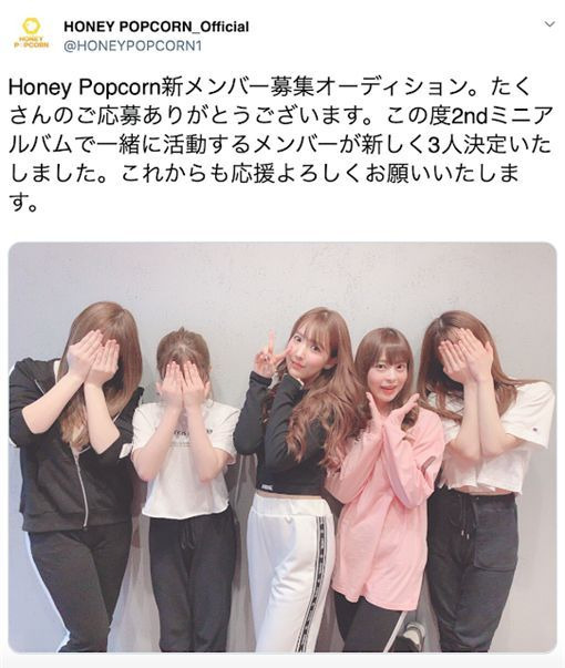 大家期待全新的Honey Popcorn新成員現身!一共加入3位新成員包括Nako Miyase 、Ruka Tajima和Sara Izumi,Honey Popcorn也首度以全新5人團形式,在日本三個城市包括澀谷、廣島和大阪舉辦小型演出,不僅是團體首個公開活動,更在現場搶先演出新曲,新加入的3人也終於露臉合照,引起大批網友留言: