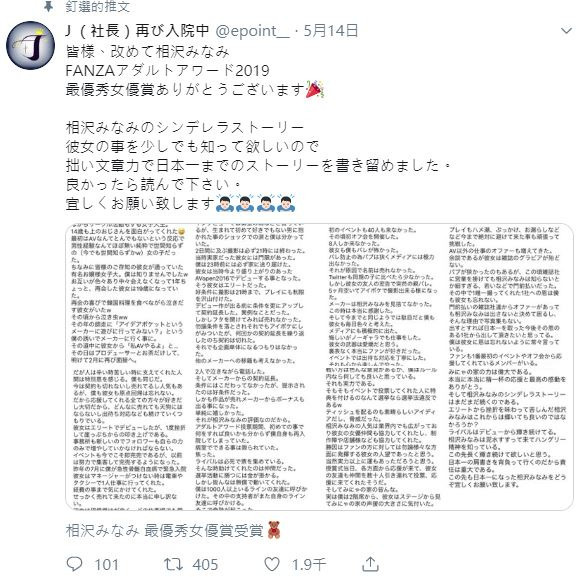 拜相澤南在業界的人氣所賜,她的女優朋友伸出了援手,製作公司與店家也伸出了援手。她的名聲在各方面都有所發揮是對粉絲來講的勝因,當然也有著超出實力的運氣。頒獎典禮當天,從各地都來了替她加油的人,她的朋友也來了幾十個人投票支持。然後就是,みにゃの家(譯註:相澤南粉絲團的稱號,「小南家族」)的各位。