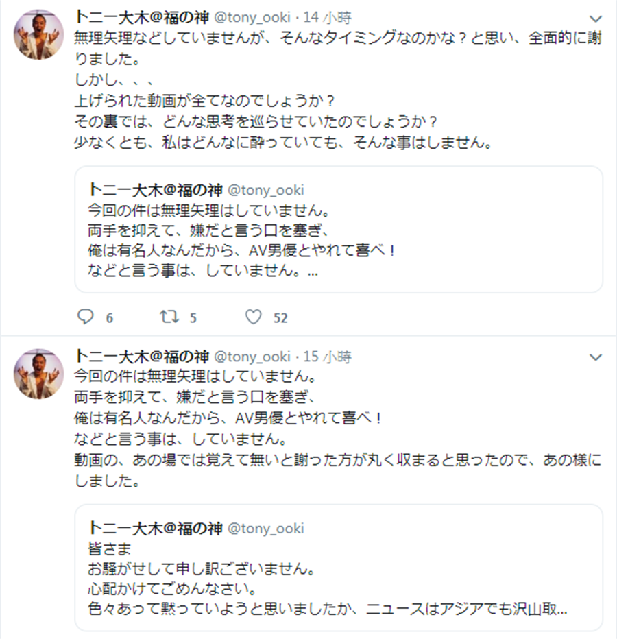 儘管東尼大木否認犯下強制性交的暴行,不過謝罪影片真的蠻難解釋的,如果沒錯為什麼要道歉?又為什麼要土下座?另外,Pierre劍在上傳影片的說明有提到中另一名被指控犯下暴行的男優横山一光事後承認東尼大木有找他串供:『一切都以不記得來回應!』這也讓東尼大木的解釋顯得有些薄弱。