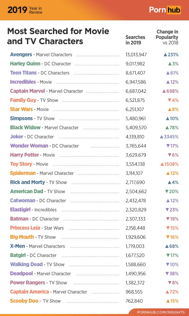 緊接在後台的是「驚奇隊長(Captain Marvel)」取得該榜的第5名,同時也是女性角色中的第2,獲得了近660萬次的搜尋,性感又堅毅的外表讓許多人為之瘋狂。2019年在榜單公布的28名中,就有13個關鍵字是屬於漫威或DC的作品,可見大家對超級英雄電影的喜愛,看完電影還不夠,還想透過色情網站「另尋慰藉」。