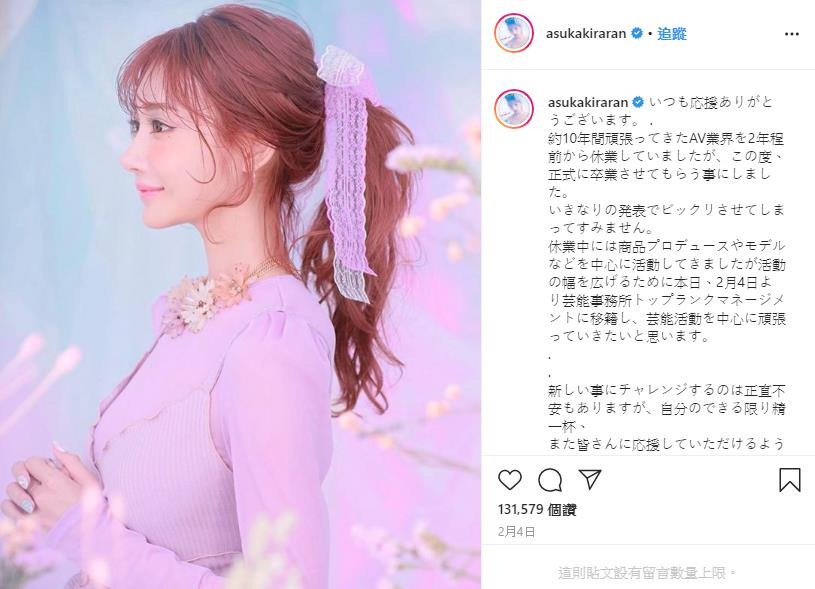 「謝謝大家一直以來的支持與愛護,從事AV職業大約10年左右的時間,雖然在大概2年前就暫停(AV)活動,但這次將正式畢業了!突然告知大家這樣的消息真的很抱歉。」