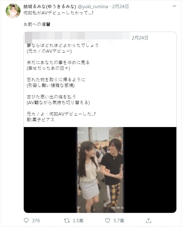 上面並附上了疑似劈腿被女友活逮的影片,原來結城留美奈轉發的就是這段影片,內文則是引用米津玄師《Lemon》歌詞寫道: