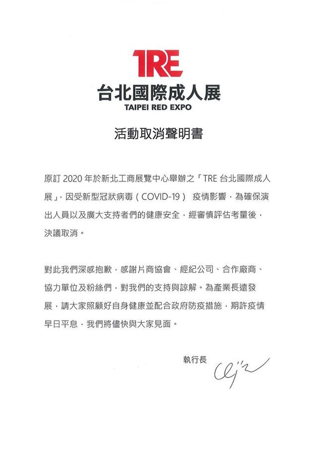 大家晚安~台灣備受男性粉絲矚目,全亞洲最大男性盛會是每年夏季最上火的活動,堪稱男性不可缺席的「TRE 台北國際成人展」,因為受新冠肺炎(武漢肺炎COVID-19)疫情衝擊,為保護出席嘉賓和粉絲的健康安全,主辦單位決議取消今年度的活動,網友們不聽到人氣女優不能來台,紛紛在貼文底下留言哀號心都碎了一地。