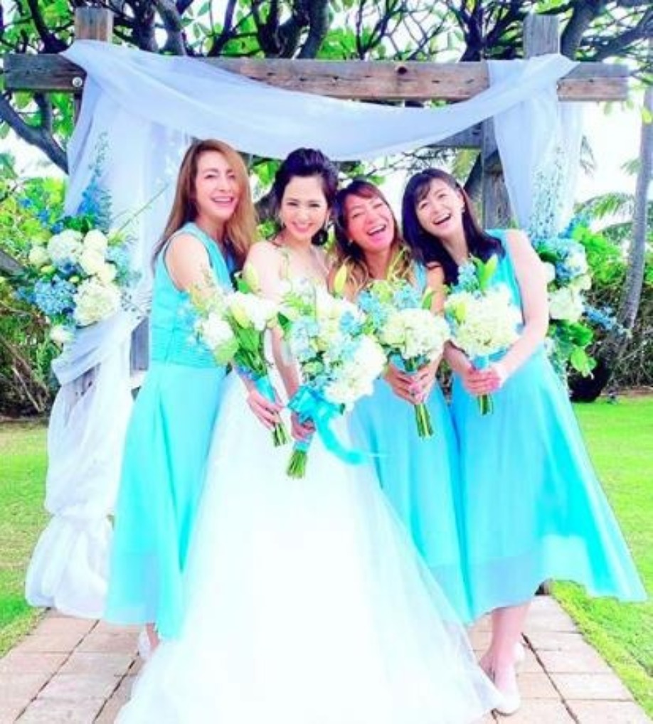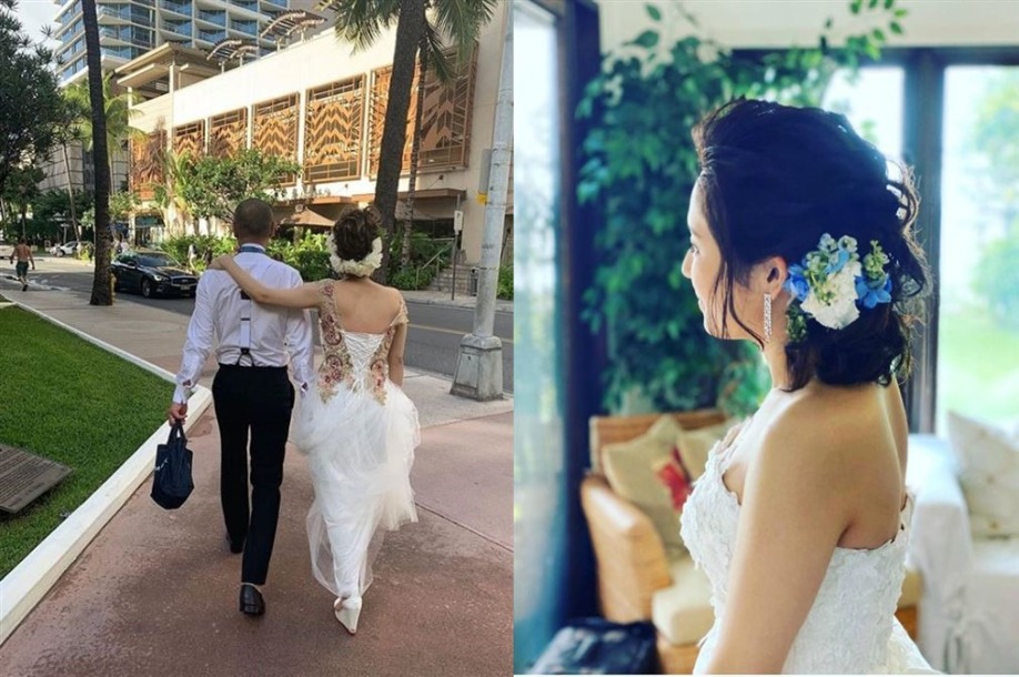 因為親戚在夏威夷從事婚禮企劃的工作,所以她一直夢想有一天結婚的話,希望能到夏威夷舉辦,同時可以帶親人到當地旅行。這次婚禮僅招待雙方父母與至親出席,所以帶同一對雙胞胎加起來僅一行16人出發到當地低調飛往夏威夷補辦。