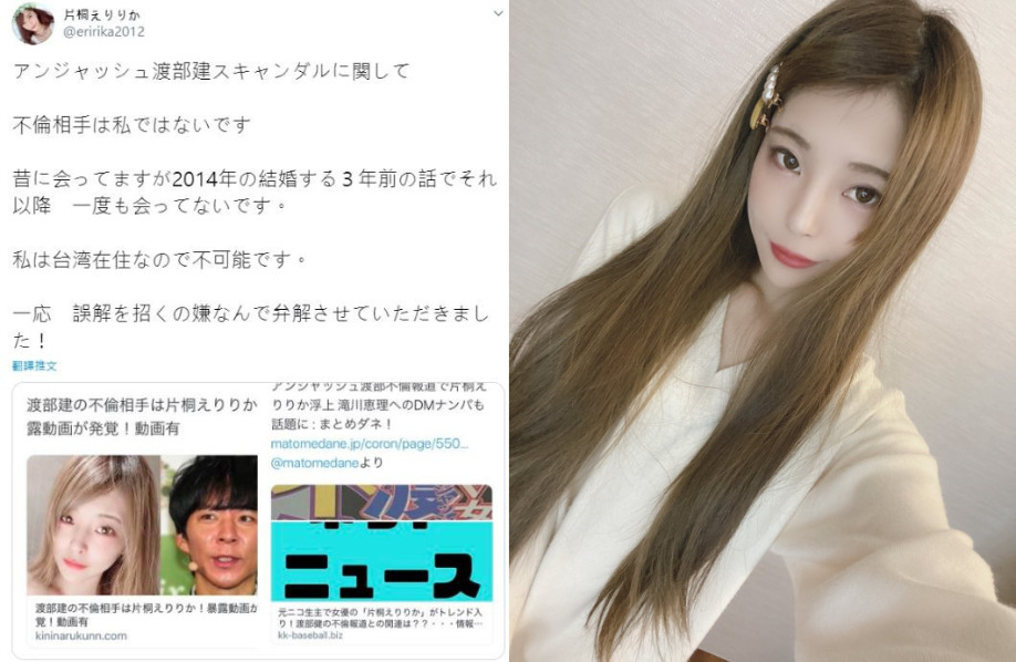 片桐Eririka這次被捲入佐佐木希老公的不倫事件,她第一時間在推特否認並對外說明: