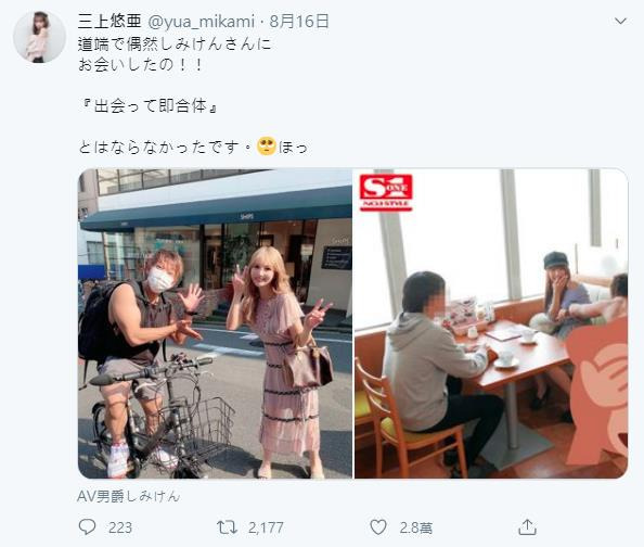 「暗黑國民偶像」三上悠亞16歲以女團SKE48出道,後來成功轉行AV女優,躍身新一代AV界女帝。平時常在社群網站分享生活點滴的她,近來開心曬出在路上偶遇有著「萬人斬」外號的AV天王清水健,大量掀起網友熱烈討論。