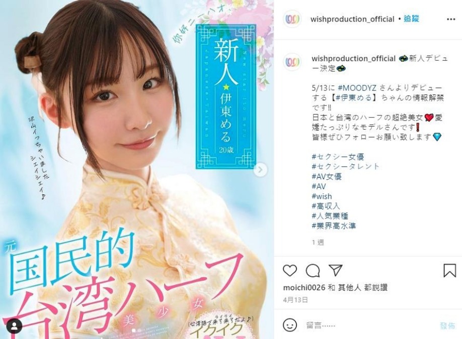 「大家好!我是伊東愛瑠,5月13日出道的AV女優!日本和台灣的混血,我的中文可能不太流利,希望你們能告訴我。」