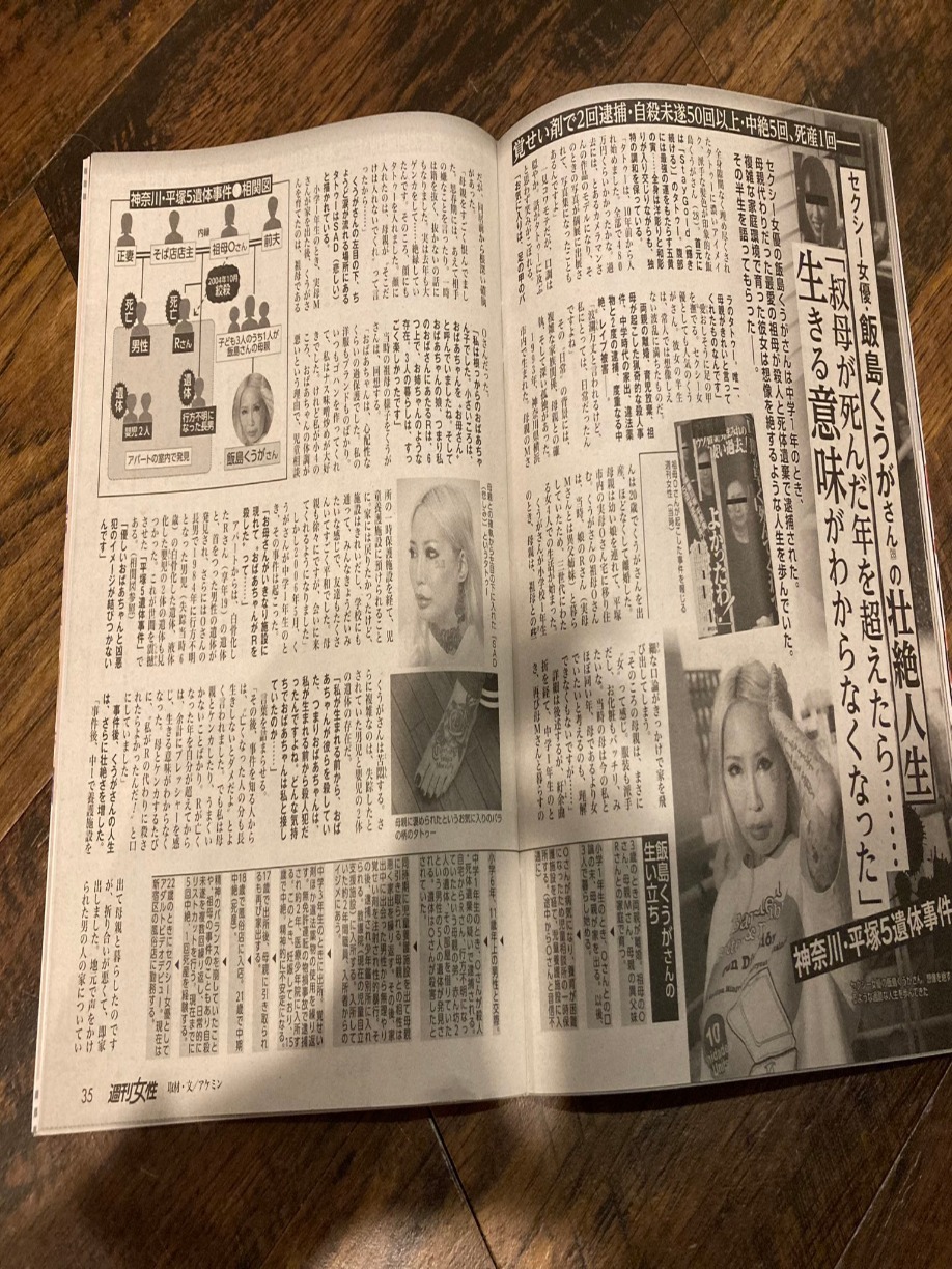 一般女優都會避免在身上留下痕跡,不過飯島KUGA反其道而行,反而因為全身刺青爆紅,鮮明的記憶點,也在競爭激烈的暗黑界中殺出血路。飯島KUGA坦言,透露過去悲慘的身世 ,自己的外婆就是「平塚5遺體事件」的殺人犯岡本千鶴子。當時不僅在岡本居住的公寓裡,發現前夫繼子山內崎宏、和前夫所生女兒岡本利加香的遺體,隨後警方更在公寓中接連發現一具早已化成白骨的男孩,還有兩具嬰屍被藏在紙箱。根據警方調查,男孩應該是岡本千鶴子聲稱失蹤多年的5歲兒子,另外兩具嬰屍是女兒利加香所生,行徑相當慘忍。