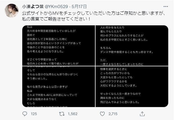 對於網友的熱烈議論,小湊四葉事後在推特PO文解釋,自己在演藝圈待了9年,引退後在一般公司上班約2年,面臨公司變動之際,她感到相當不安,深思熟慮之後,希望自己的人生能夠做出一些改變,小湊四葉更說著;「帶給他人快樂」才是對她有意義的生存方式,雖然可以像以往透過歌舞表演取悅大家,但她不願走回頭路,最重要的是...