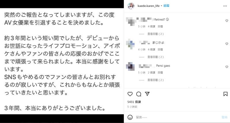 隔幾天楓可憐再一次清空個人社交媒體,在影迷們開始議論紛紛時,她在Twitter及Instagram貼出一份引退宣言。內容大意是三年來很感謝事務所Life Promotion和片商IdeaPocket的照顧,接下來會關閉所有社交媒體帳號,「為將來的人生好好努力」。對於如此官腔的引退宣言,網友並不埋單,更發現了一些疑點。