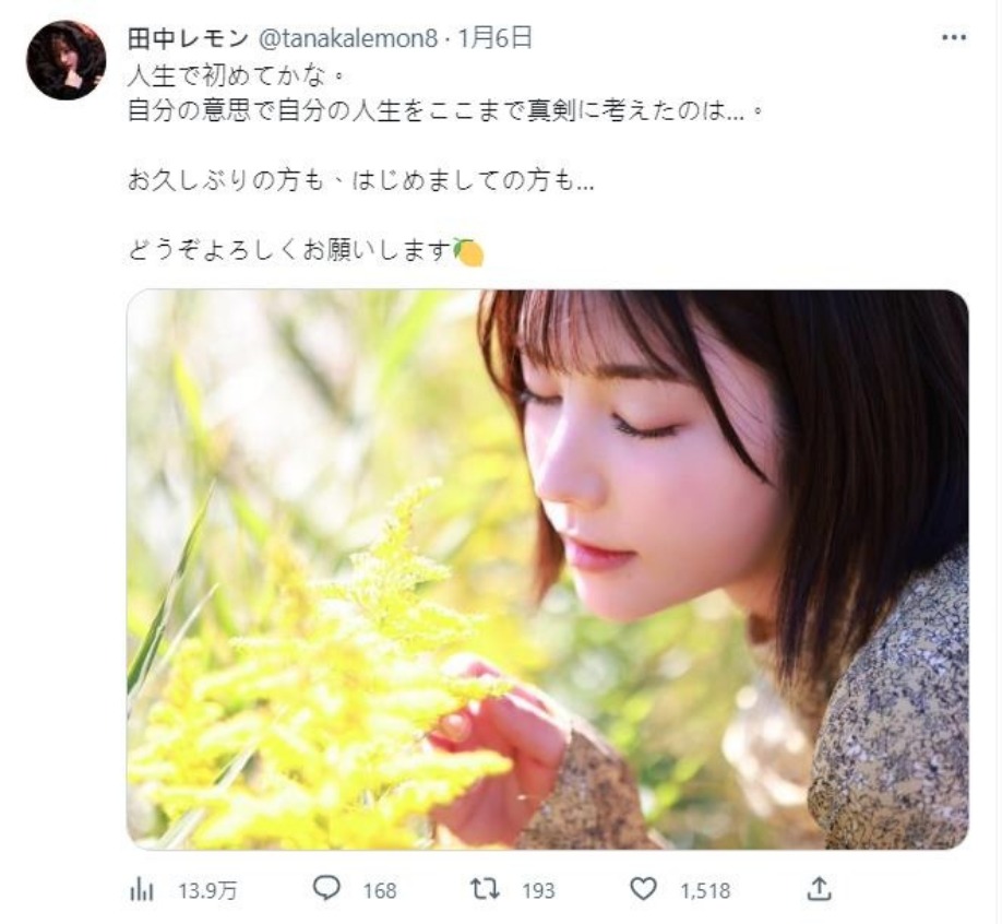 好了我們就來看看田中檸檬twitter的第一篇貼文到底寫了什麼?她可是寫下很不得了的話呢: