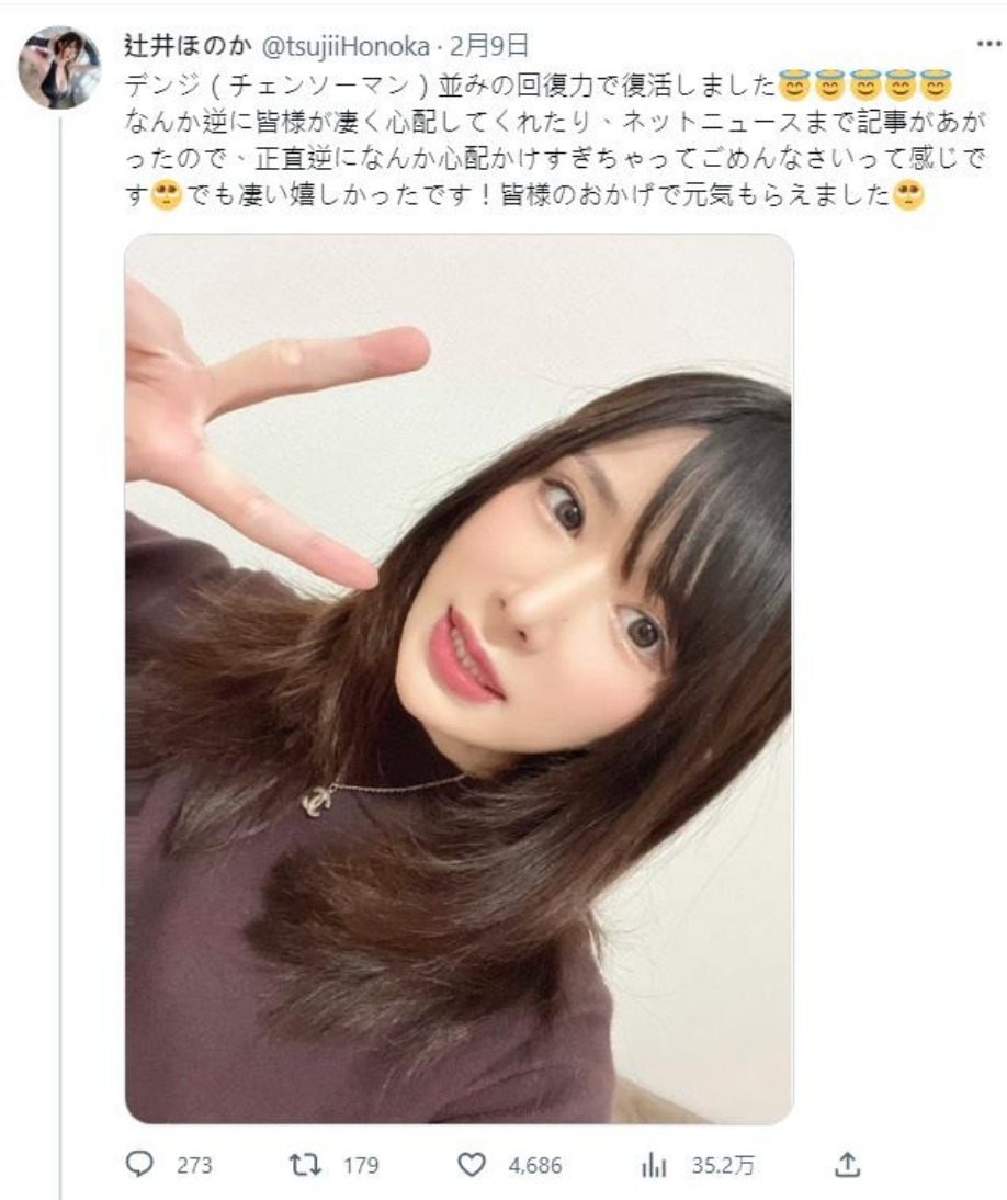 辻井穗乃果非快的更新了twitter,說自己以デンジ(淀治,鏈鋸人チェンソーマン的主角)的回復力快速康復中,雖然骨折的地方還是會痛,但她沒事了,她也非常感謝大家關心〜