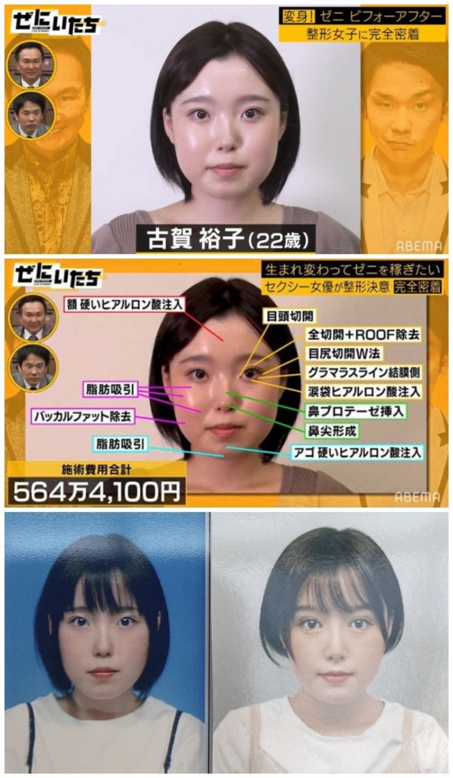 古賀裕子表示,自己想成為等級最高的單體女優,為了變美,因此她去整形。她在節目中透露,砸了564萬4100元日幣(約新台幣123.5萬元)進行整形,整形內容包括開眼頭、隆鼻、抽取脂肪填充蘋果肌,也在額頭等處打玻尿酸,她也在推特上分享自己整形前後的照片。從整形前後的照片可以看出,古賀裕子之前得眼睛比較小,整形後變得更大更圓潤,鼻子也更堅挺,臉型也比以前更加勻稱,與之前簡直判若兩人,讓許多人相當驚訝。