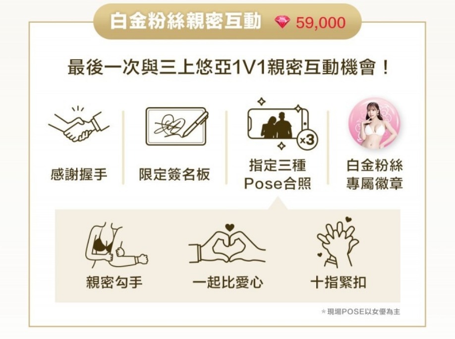事實上,TRE台北國際成人展官網顯示,三上悠亞白金粉絲親密互動售價3776元,可以和三上悠亞握手、指定三種POSE合照,並獲得限定簽名板和粉絲徽章,在三種POSE的下方雖有寫道「親密勾手、一起比愛心、十指緊扣」等範例,但有一行小字備註「現場POSE以女優為主」XD,所以啦,應該是女神那邊實在太忙碌了,請粉絲息怒。