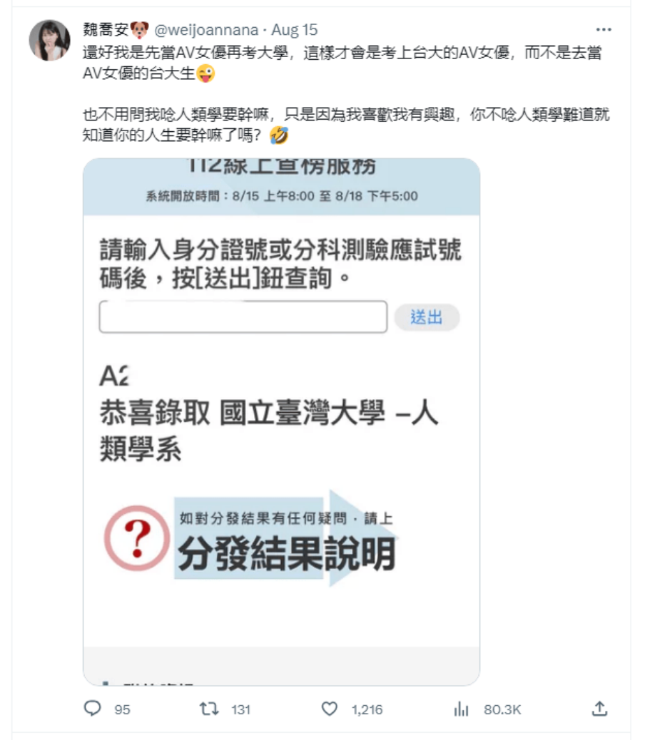 112學年度大學分發入學日前放榜,21歲AV女優魏喬安在推特PO出她錄取「台大人類學系」通知,引發討論。她表示,「還好我是先當AV女優再考大學,這樣才會是考上台大的AV女優,而不是去當AV女優的台大生」。