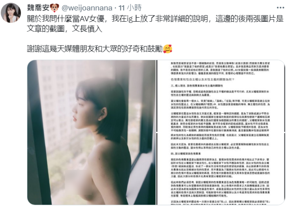 魏喬安自己到是這麼說,她認識的男優和女優中,也有人學歷十分優秀,有「曾考上台大」的男優和「在日本留學過」的女優,當然這次會引起這麼大的關注度,是「當AV女優」和「考上台大」的對比實在太違和,這樣的反差顛覆了大家舊有認知。