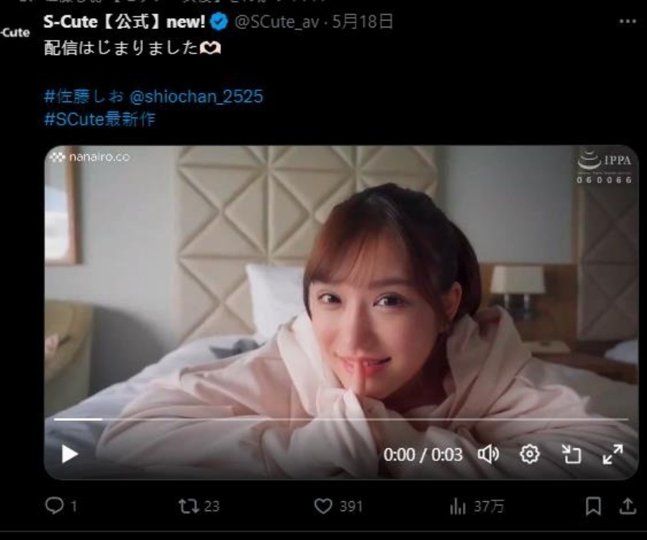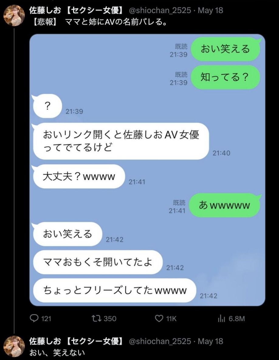 去年剛出道的G級女優『佐藤汐(佐藤しお)』,在 X 上以「悲報」表示,自己 AV女優的身分竟然被姐姐和媽媽知道了這次真的完蛋了啦!