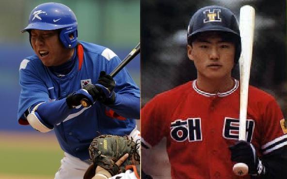 (左:韓國代表隊金賢洙,右:韓職HAITAI Tigers金賢洙。同樣是棒球選手,際遇卻大不同!)
