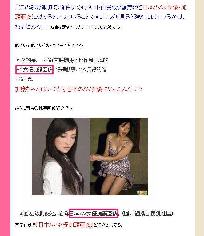 之前國內新聞網站NXWnews刊載了一篇八卦消息,內容指知名陸籍乒乓球選手王勵勤,被人拍到與新女友-成都電視台第二頻道主持劉彥池(見照片)卿卿我我地逛世博。一件只是個普通的八卦,但該文中這麼形容八卦女主角劉彥池的容貌:「一些網友將劉彥池比作是日本的AV女優加護亞依(加護亜依),仔細觀察,2人長得的確有點像」。