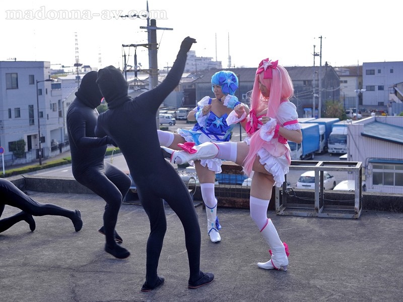 不過,雖然「姐妹戰隊」的題材很常見,「母女戰隊」請恕筆者才疏學淺,真的沒怎麼聽說過。這部「閃亮瑪丹娜戰士.星星天使(暫譯)」是北都集團新成立的熟女片商Fitch的第一部扮裝特攝片。為了實現「母女搭檔的變身女戰士」這種嶄新到整個不可思議的題材,他們找來了外形稚嫩卻有對巨乳的小坂惠(小坂めぐる),以及當Fitch團隊還在Modonna旗下時就時常合作的風間由美(風間ゆみ)同台演出。
