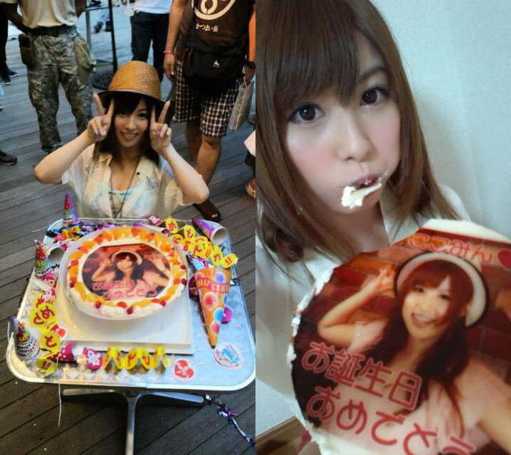 這個繪有心美照片的大蛋糕,是心美目前每周參與的廣播節目「歌舞伎町NO.1 RADIO SHOW」製作單位為她準備的生日禮物。這個節目同時邀請了現役AV女優成瀨心美與櫻心美(桜ここみ)兩位心美同台演出,陣容堅強噱頭十足,偷人在下小弟我也曾經報導過該活動的消息。雖然活動的日期沒有真的對上心美的生日八月十日,不過製作人佐藤下足本錢把氣氛炒得熱鬧非凡,還是讓心美哭得假睫毛都掉了。