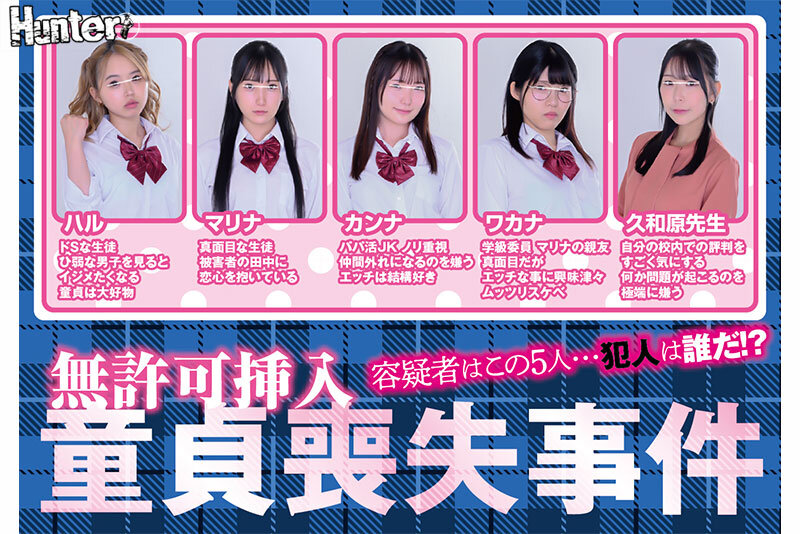我的摯友被某人用藥迷昏,在無意識的狀態下被奪走了童貞!他一直珍重守護著這份重要的童貞,堅信第一次絕對要和喜歡的女生一起!然而,他卻失去了這份珍貴的第一次…。從現場證據來判斷,犯人絕對是班上的某個人。為了找出犯人,我決定展開細緻的調查。結果,浮現出包括老師在內的五名女性嫌疑人。透過與這五名嫌疑人接觸,並根據摯友模糊記憶中的口交觸感、插入的感覺、體味等,進行實際的「玩法驗證」來確定犯人。沒想到,等待著我的竟是一個出乎意料的結局!是誰?出於什麼理由?謊言與真相交錯的童貞喪失事件背後的真相究竟是什麼?色情與尋找犯人無違和感地結合,帶來全新感受的懸疑AV,絕對不容錯過任何一瞬間!